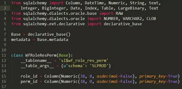 所有的映射类都是继承自基类Base,declarative_base() 创建了一个BaseModel 类,这个类的子类可以自动与一个表关联。此处以 WfRoleResPerm 类为例,它的 __tablename__ 属性就是数据库中该表的名称,它有 role_id 和 perm_id 这两个字段,分别为Numeric和 38 个定长字符。