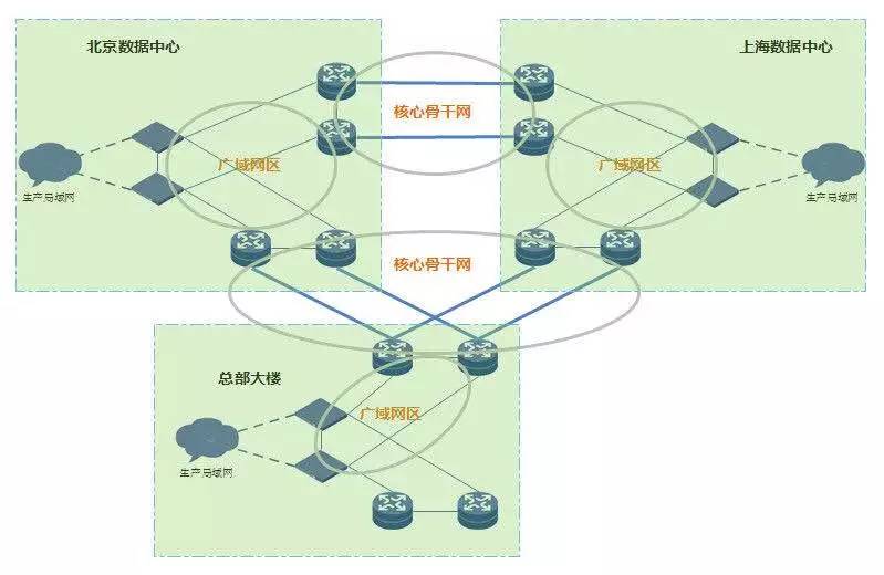 本文以某大型机构机构的广域组网为例,图1为该金融机构的全国数据中心网拓扑图: