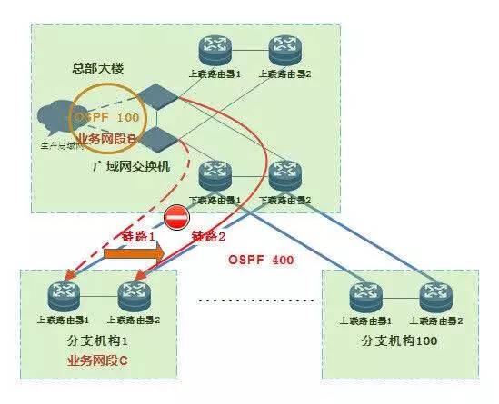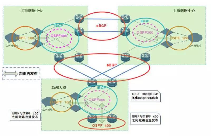 分支机构广域网运行OSPF 400进程,总部大楼下联路由器为iBGP与OSPF 400的路由再发布边界,用于交换分支机构与总部大楼的路由。