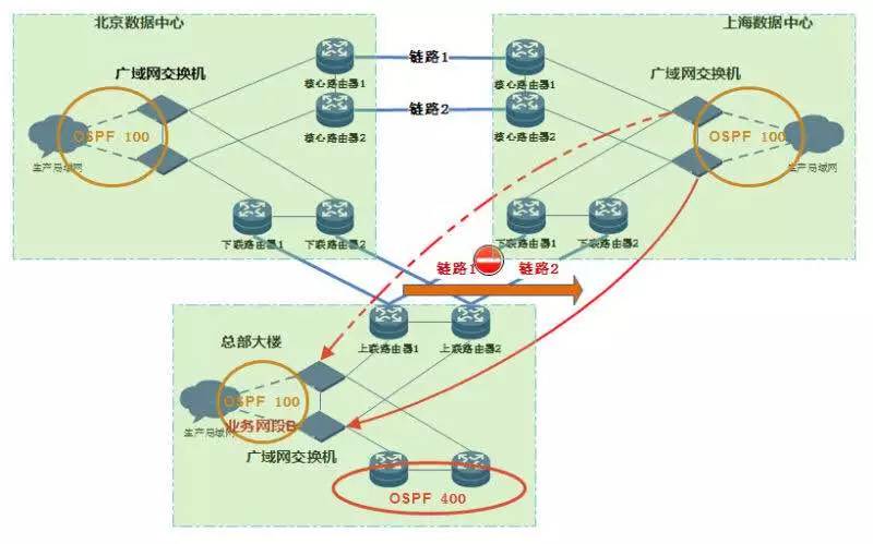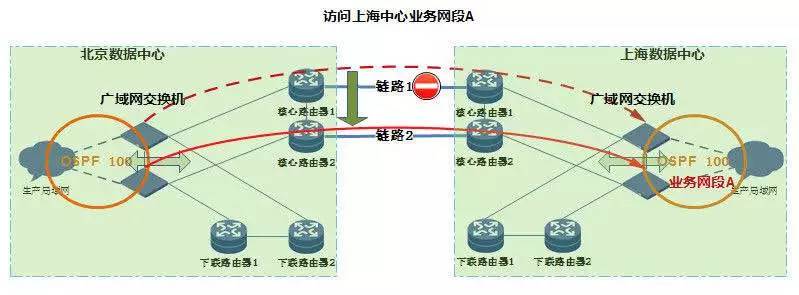 (3)北京中心广域区交换失去到业务网段A的路由,于是向北京中心核心路由器2发送网段A的路由撤销,并在OSPF 100中删除网段A的外部路由,北京中心局域网内部到业务网段A的路由中断。