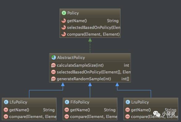从类结构图上看一共有三种缓存淘汰策略分别是:LFU,LRU,FIFO。关于这三个概念在前面都已经有过解释,我们直接这三个的源码: