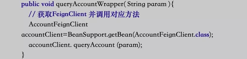 4. 上一步骤中AccountFeignClient.queryAccount() 不存在,Alt+Enter创建该方法 ,方法体中打通到AccountServicey.queryAccount 的调用.