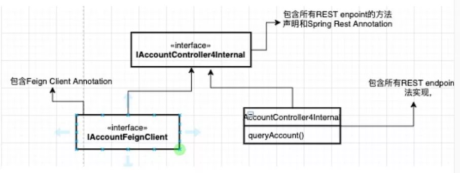 1. 对于AccountFeignClient 类添加Feign annotation, 并进行extract interface 得到IAccountFeignClient,注意replace reference 到新interface,AccountFeignClient成为无引用状态unused 。