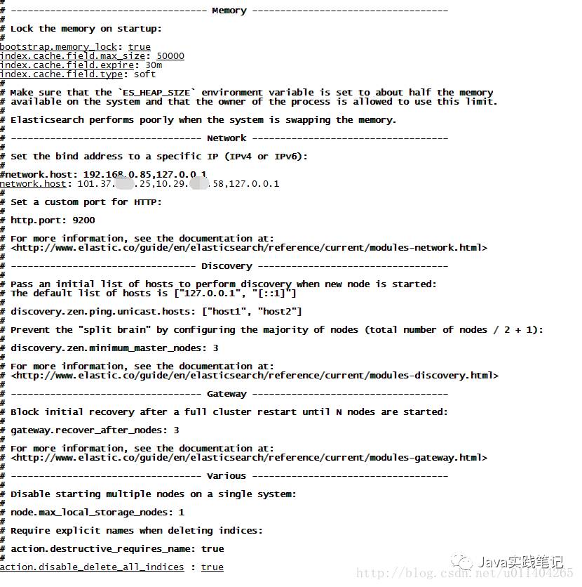 这里我们绑定了三个ip,并禁用掉删除全部索引的功能,同时针对ES的内存和缓存进行优化
