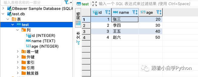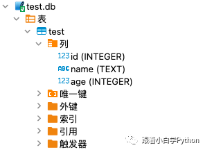 通过以上操作我们创建了一个名为test.db的数据库文件,数据库中有一个名为test的表,此时表中没有数据。通过数据库管理工具查看数据库结构如下: