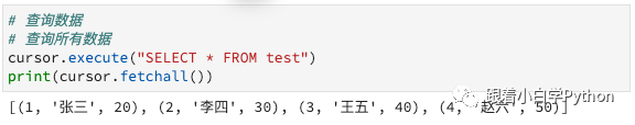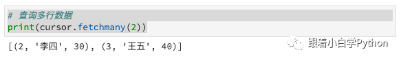 cursor.executemany("INSERT INTO test VALUES(?,?,?)",[(3,'王五',40),(4,'赵六',50)])
