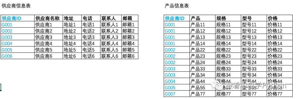 在之前的学习中,我们都是在一张表中查询或是处理数据。但是实际上数据库都是将一类数据存储在一张表中的。比如:供应商信息表中只存储供应商的信息,而产品信息表则只存储产品信息。如下示意,两张表存储着不同的信息。