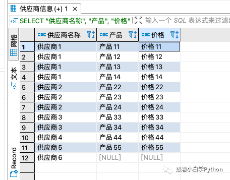细心的小伙伴可能已经注意到了,供应商信息表里有供应商6但是输出的表里只有供应商5,这是因为我们使用了where语句,限定了其范围。我们去掉where语句看看:SELECT