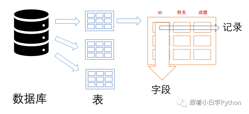 一个常见的数据库通常包括一个或多个表,我们把它们看作很多Excel表。表的每一行称为记录(Record)。表的每一列称为字段(Column),同一个表的每一行记录都拥有相同的若干字段。字段定义了数据类型(整型、浮点型、字符串、日期等)。示意如下: