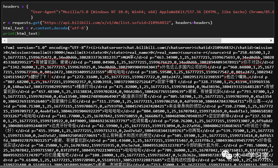 headers = {"User-Agent":"Mozilla/5.0 (Windows NT 10.0; Win64; x64) AppleWebKit/537.36 (KHTML, like Gecko) Chrome/85.0.4183.121 Safari/537.36",}r = requests.get("https://api.bilibili.com/x/v1/dm/list.so?oid=210964832", headers=headers)html_text = r.content.decode('utf-8')print(html_text)