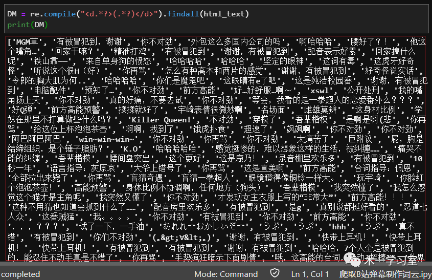 for i in DM:with open(r'弹幕.csv',"a", newline='',encoding='utf-8-sig') as f:DM = []DM.append(i)writer= csv.writer(f)writer.writerow(DM)