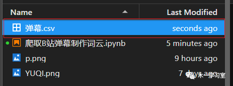 运行完成可以发现当前文件夹下多了一个名为弹幕的csv格式文件,可以用excel打开