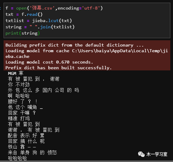 f = open('弹幕.csv',encoding='utf-8')txt = f.read()txtlist = jieba.lcut(txt)string = " ".join(txtlist)print(string)