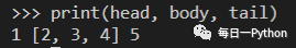 l = [1,2,3,4,5]head, *body, tail = lprint(head, body, tail)