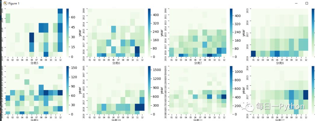 本来觉得直接用seaborn的facetgrid就可以,但是写的时候发现热力图有些不一样,它要求输入的数据格式不同。热力图的横纵坐标是年月标签,不像别的图像是散点图,横坐标是标签,纵坐标表示数据;