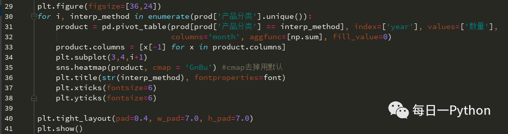 可以看到,需要先建立一个循环遍历“产品分类”中的所有类别,然后用pivot_table进行数据聚合,按产品分类进行求和;数据准备好后,设置子图格式:subplot(3,4,i+1)画一个3行4列的子图,i表示每次子图的位置+1,定位到子图位置后直接调用sns.heatmap()热力图函数就可以了;循环完后要加tight_layout()调整子图之间的间隔来减少堆叠。