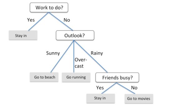 训练决策树模型时,我们从根节点出发,使用信息增益(information gain, IG)最大的特征对数据分割。然后迭代此过程。显然,决策树的生成是一个递归过程,在决策树基本算法中,有三种情形会导致递归返回: