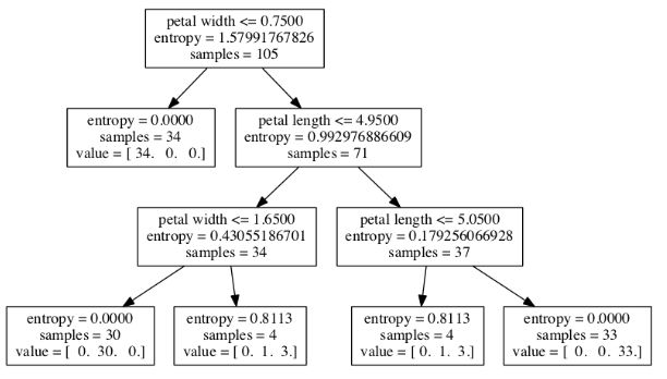 2export_graphviz(tree, out_file='tree.dot', feature_names=['petal length', 'petal width'])