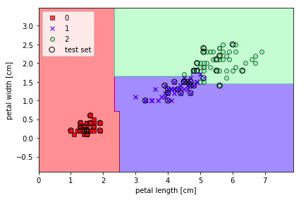 上面讲了这么多原理,还是要放一些code来给大家学习一下。决策树通过将特征空间分割为矩形,所以其决策界很复杂。但是要知道过大的树深度会导致过拟合,所以决策界并不是越复杂越好。我们调用sklearn,使用熵作为度量,训练一颗最大深度为3的决策树,代码如下: