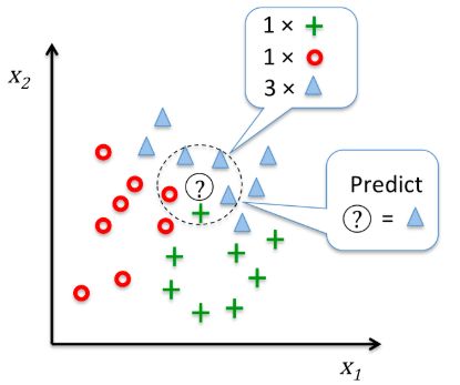 对每一个测试样本,基于事先选择的距离度量,KNN算法在训练集中找到距离最近(最相似)的k个样本,然后将k个样本的类别的投票结果作为测试样本的类别。