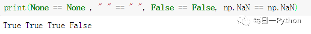 前三种类型中 打印 None == None ," " == " " ,False == False都能返回判断True,但是np.NaN == np.NaN 却返回为False,如图: