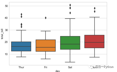 箱线图 ax = sns.boxplot(x="day", y="total_bill", data=tips)