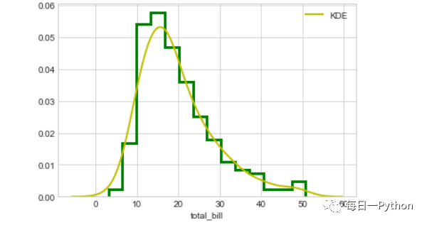 kde_kws={"color": "y", "lw": 2, "label" : "KDE"},