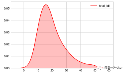 ax = sns.kdeplot(tips['total_bill'], shade= True, color="r")