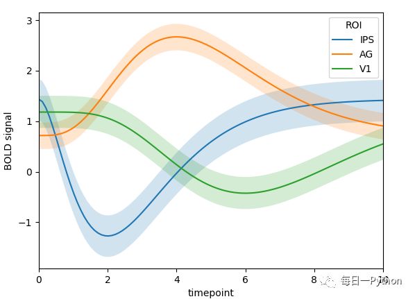 gammas = sns.load_dataset("gammas") ax = sns.tsplot(time="timepoint", value="BOLD signal", unit="subject",condition="ROI",data=gammas)