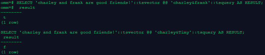 SELECT 'charley and frank are good friends!'::tsvector @@ 'charley&frank'::tsquery AS RESULT; SELECT 'charley and frank are good friends!'::tsvector @@ 'charley&Timy'::tsquery AS RESULT;