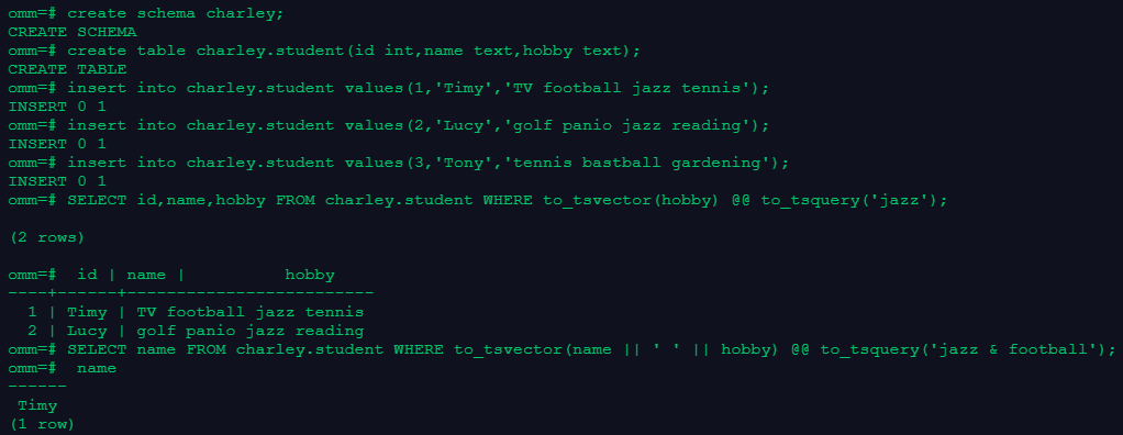 SELECT id,name,hobby FROM charley.student WHERE to_tsvector(hobby) @@ to_tsquery('jazz');