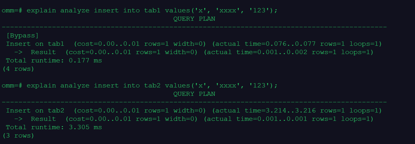 explain analyze insert into tab1 values('x', 'xxxx', '123');