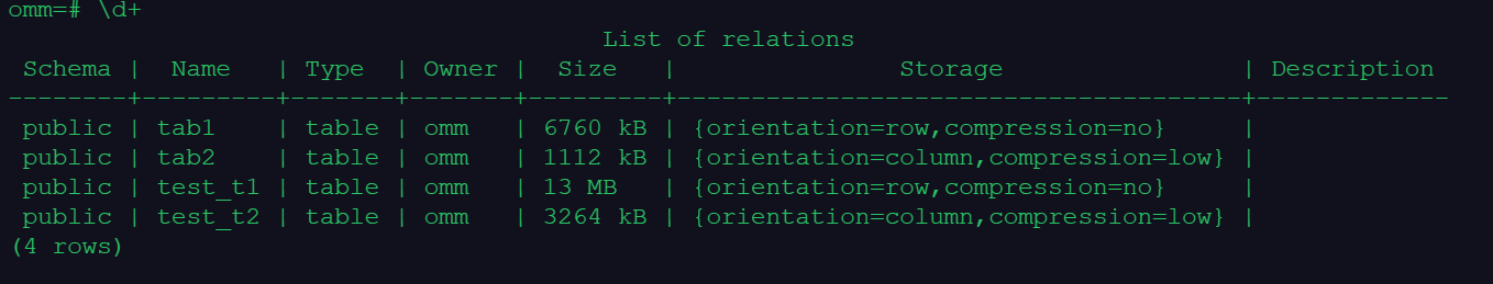 insert into tab2 select * from tab1;2.对比行存表和列存表空间大小