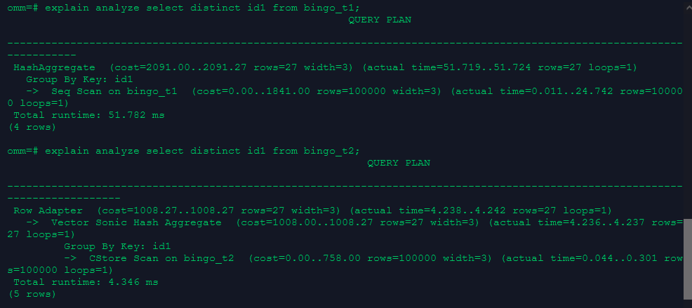 explain analyze select distinct col1 from test_t2;5.对比插入一行的速度