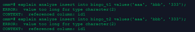 explain analyze insert into bingo_t1 values('a', 'ccc', '333');
