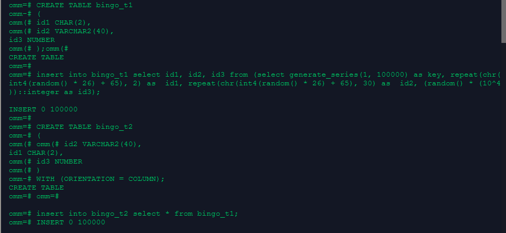 insert into bingo_t1 select id1, id2, id3 from (select generate_series(1, 100000) as key, repeat(chr(int4(random() * 26) + 65), 2) as id1, repeat(chr(int4(random() * 26) + 65), 30) as id2, (random() * (10^4))::integer as id3);