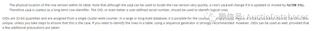 意思就是这个ctid 字段在表里面行版本表示这一个行的物理位置。请注意,虽然可以使用ctid非常快速地定位行版本,但是如果更新或移动了某个行的ctid,它就会发生变化。因此,ctid作为长期行标识符是无用的。应该使用OID,或者用户定义的序列号来标识逻辑行。