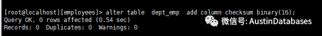 我们看一下,我们要对当前的表添加一个字段,具体是什么字段类型不重要,这里只是模拟一下。checksum 就是那个添加的字段 binary