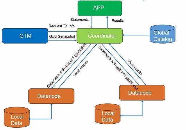 熟悉pg的人对pgxc都不陌生,pgxc最初由stromdb公司开发,应用于商业,后来被TransLattice收购并将其开源,也就是现在的pgxl。Pgxc是基于pg的非常成熟的分布式架构,是一款混合负载的htap数据库。国内也有很多基于pgxc来做的分布式数据库,例如华为GaussDB-A,腾讯Tbase,亚信antdb等或多或少都借鉴了pgxc的架构理念。pgxc的总体架构大家都很清晰了,不再赘述。