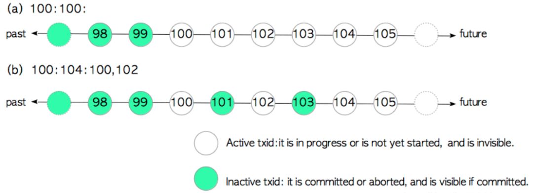 xid<100的事务不活跃,xid≥100的事务活跃,100和102号事务当前活跃,101,103号事务不活跃。