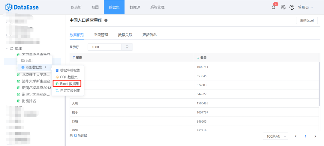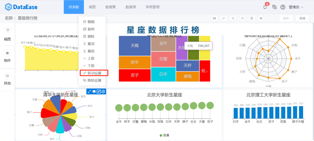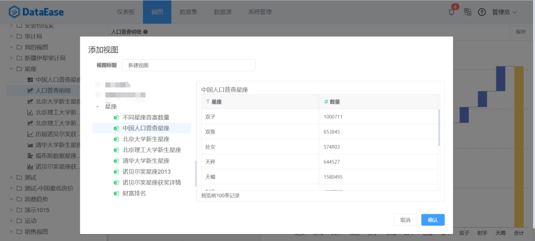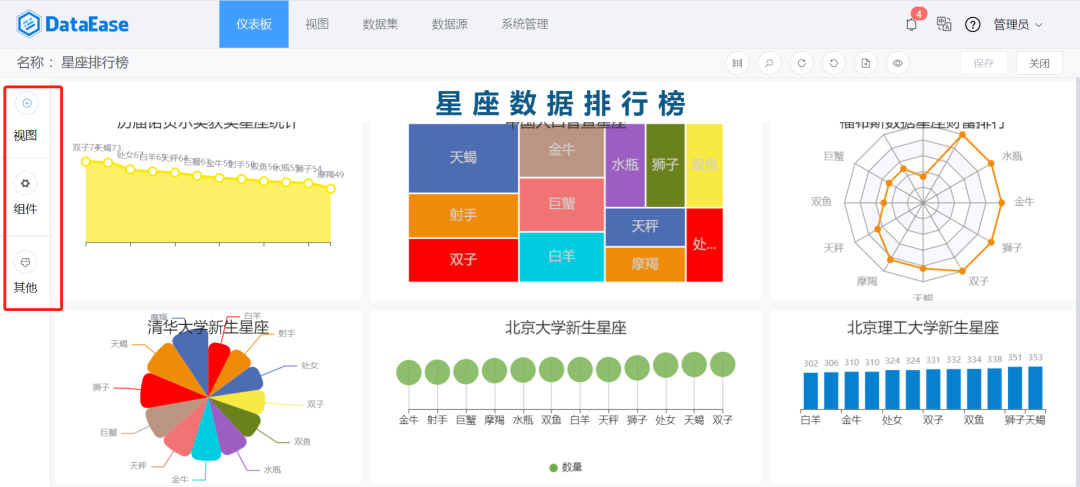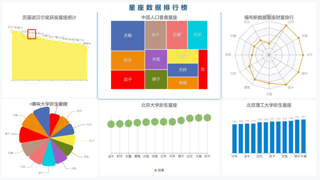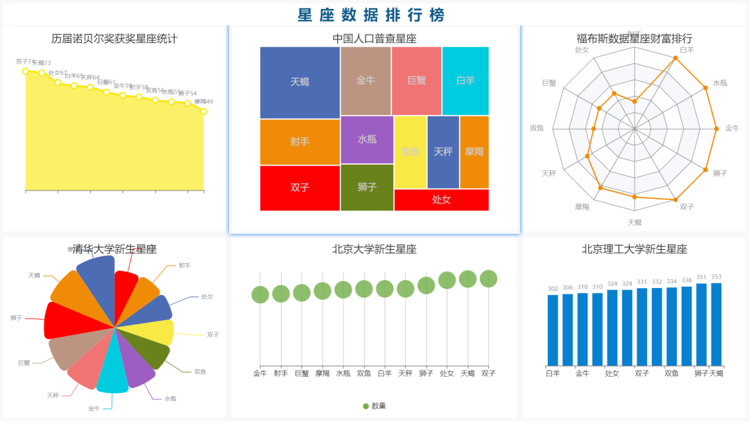 本文使用DataEase工具,通过对中国人口普查数据、诺贝尔奖获奖数据、福布斯富豪排行榜以及北京几所大学新生数据进行统计,制作了一个关于星座分析的仪表板大屏。下面来详细介绍整个仪表板的制作过程。