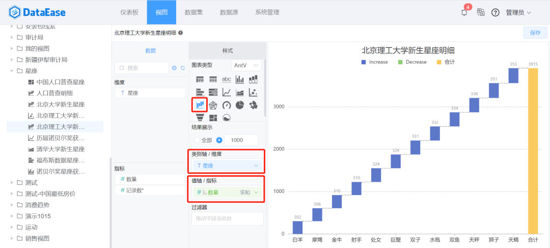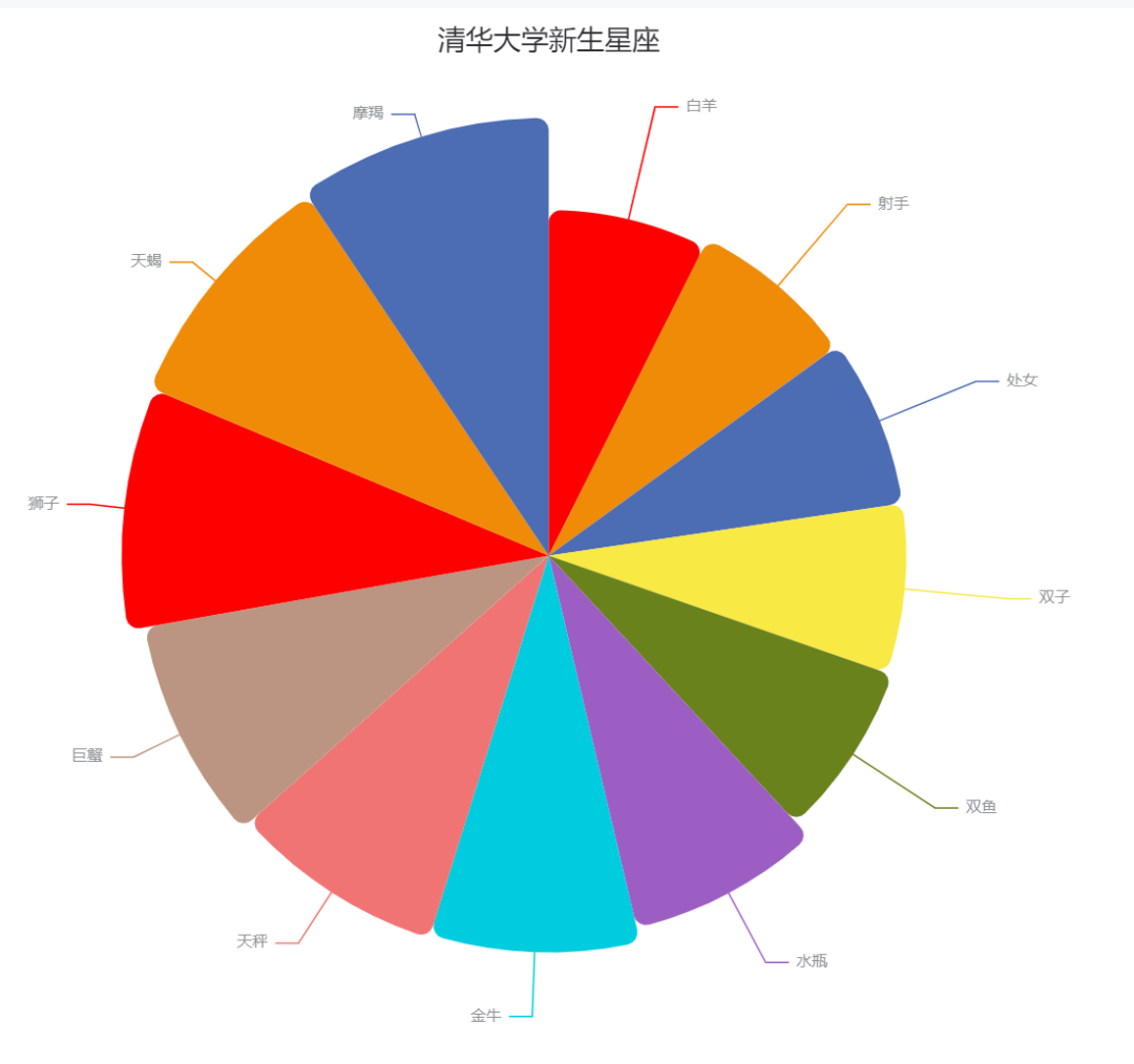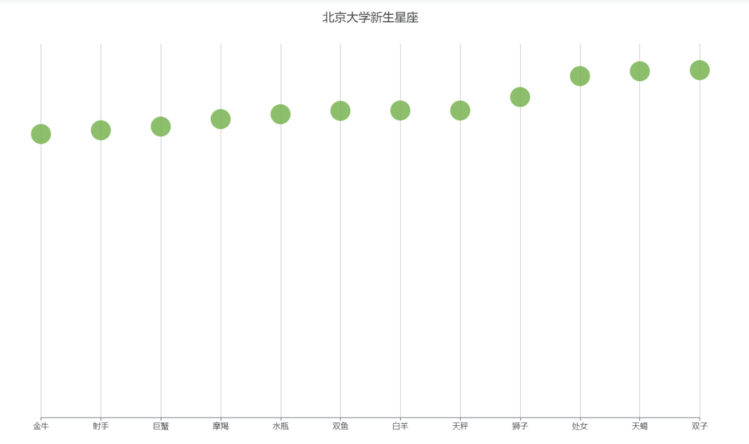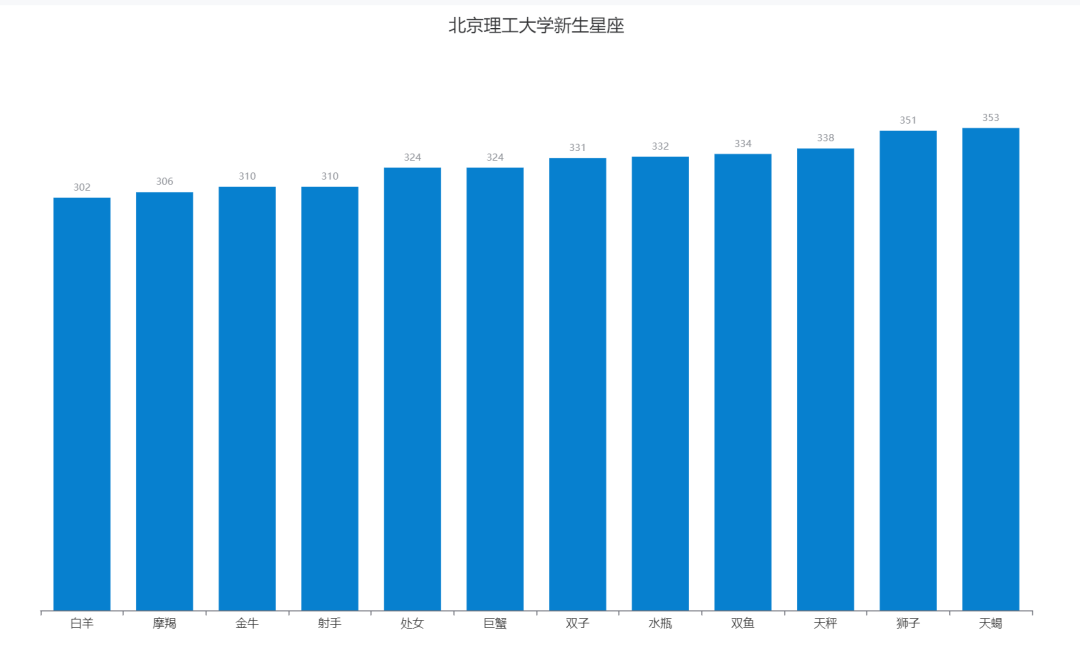 为了能够更加直观地看出北京理工大学新生中哪个星座的人数最多,这里选择使用瀑布图。通过对比每一个柱体的垂直高度,一眼就可以看出“狮子”和“天蝎”的人数占比最高。