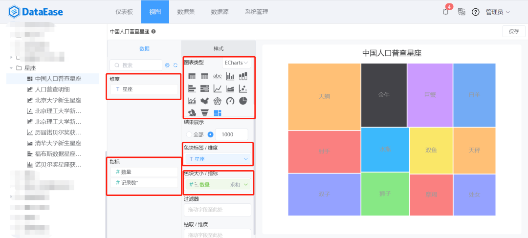选择“矩形树图”图表类型,将字段“星座”拖入维度框里,将值“数量”拖到“指标”框里,效果如图: