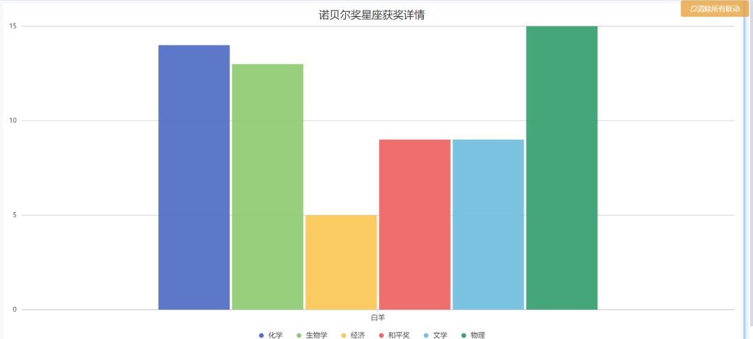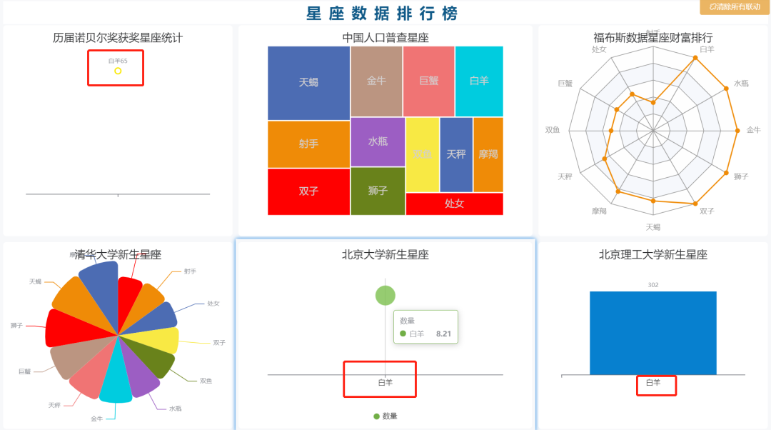 如下图,点击“清华大学新生星座”视图的“白羊”数据,联动的视图只展示“白羊”的联动字段数据。如果想取消联动效果,点击页面右上角的“清除所有联动”按钮即可。