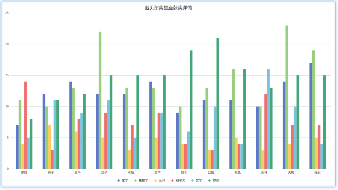 下图为12星座在诺贝尔奖各领域的获奖情况(单位:人次)。我们可以看出在诺贝尔奖得主中: