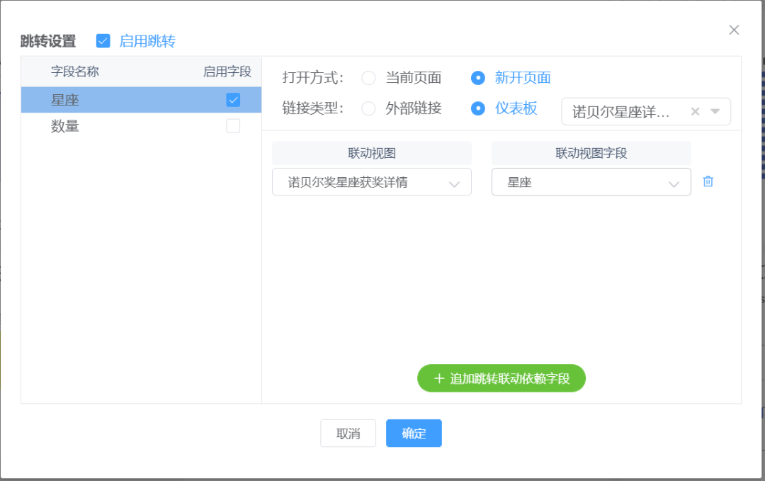 选择“启用跳转”选项,勾选“星座”字段,选择打开方式(包括“当前页面”和“新开页面”)和链接类型(包括“外部链接”和“仪表板”)。选择联动视图和跳转的仪表板,并追加跳转联动依赖字段,就可实现两个仪表板之间的跳转查询功能。