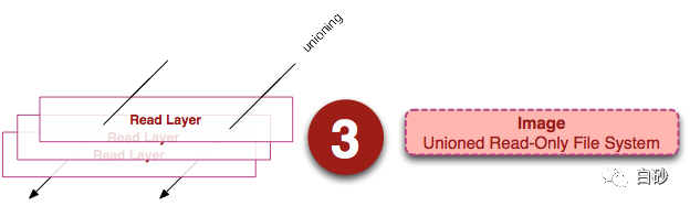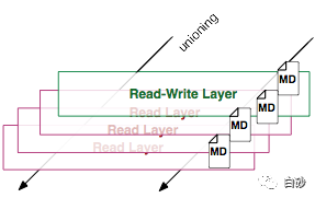 从左边看到多个只读层,他们重叠在一起。除了最下面的一层,其它层都会有一个指向下一层的指针。
