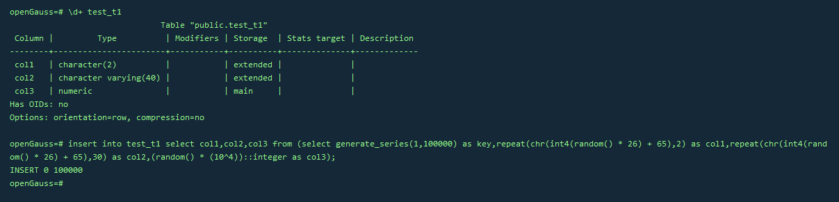 insert into test_t1 select col1, col2, col3 from (select generate_series(1, 100000) as key, repeat(chr(int4(random() * 26) + 65), 2) as col1, repeat(chr(int4(random() * 26) + 65), 30) as col2, (random() * (10^4))::integer as col3);