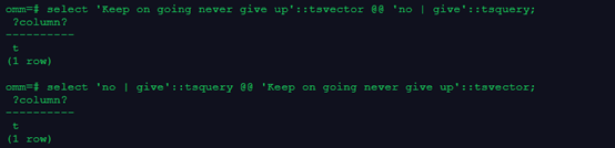 select 'Keep on going never give up'::tsvector @@ 'no | give'::tsquery;select 'no | give'::tsquery @@ 'Keep on going never give up'::tsvector;