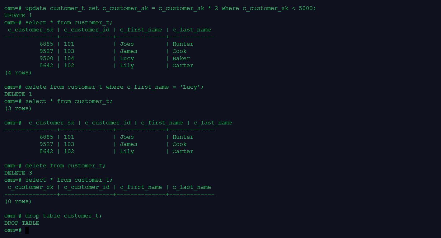 –删除c_first_name为Lucy的记录omm=# delete from customer_t where c_first_name = 'Lucy';